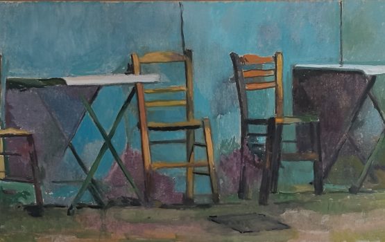 Στην εικαστική συλλογή της ΔΠΚ υπάρχουν από παλαιότερα τέσσερα (4) έργα του σημαντικού καλλιτέχνη και τα δύο από αυτά προέρχονται από την πολύτιμη δωρεά του Απόστολου Κάρκα. Στο έργο που μόλις παρέλαβε η ΔΠΚ, αποδίδεται ένα παλιό καφενείο (π. 2023, ελαιογραφία σε μουσαμά, 50 x 120 εκ.).
