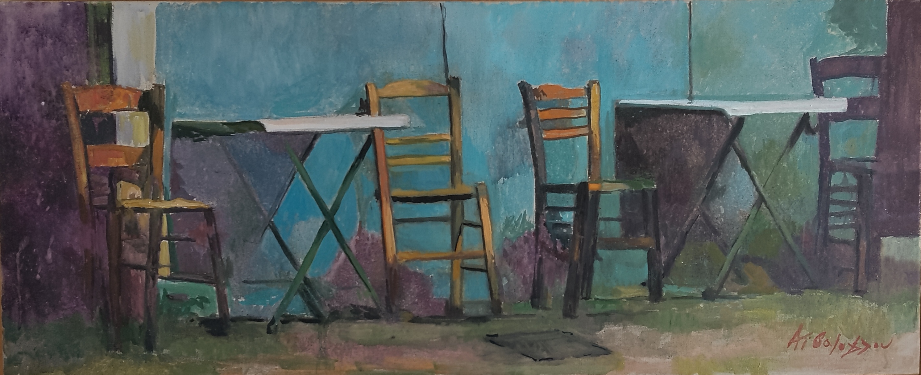 Ο Αχιλλέας Αϊβάζογλου υπηρετεί μια αισθαντική ζωγραφική. Ένα βλέμμα που περιπλανιέται στον χώρο κι εντοπίζει σημεία ενδιαφέροντος. Στο έργο: ‘παλιό καφενείο’ συναντώνται η τρυφερότητα του άνθρωπου που βλέπει, η παρουσία αυτού που παρατηρείται, η επίγευση της προσωπικής εμπειρίας και μαζί η καλά εξασκημένη τεχνική διαπραγμάτευση του δημιουργού. Τοπία της πόλης όπου σκηνογραφούνται στιγμές της καθημερινότητάς μας. Ο καλλιτέχνης αξιοποιεί τη δύναμη του χρώματος και την καθαρότητα του σχεδίου. Δημιουργεί ευρύχωρες χρωματικές περιοχές που εναλλάσσονται και αλληλοσυμπληρώνονται, έτσι καθώς ενοποιούνται τα αποδιδόμενα αντικείμενα, οι σκιές και ο χώρος που τα περιέχει. Εφαρμόζει αυστηρή παρατακτική δομή, τάξη και ρεαλιστική απεικόνιση που εν μέρει αίρεται από την αταξία που δημιουργεί η πατίνα του χρόνου. Το τελικό αποτέλεσμα είναι μια ατμοσφαιρική συνθήκη, παραστατική, γήινη και έντονα φορτισμένη από ζωή, αλλά και από την παροδικότητά της: τα πραγματολογικά στοιχεία, η εμπειρία, η οικειότητα, η φυσική φθορά, οι μνήμες και η νοσταλγία συμμετέχουν ταυτόχρονα και υποβάλλονται από τους ιδιαίτερους χρωματικούς τόνους που πλάθουν τα αναπαριστώμενα. Οι χειρονομίες του καλλιτέχνη, οι καταγραφές και οι αποσιωπήσεις του – όλα υπομνηματίζουν την ανθρώπινη παρουσία και / ή απουσία, το βίωμα, την προσωπική εμπλοκή, την ενδοσκόπηση και τα συναισθηματικά φορτία από το μικρο-κλίμα και τη ζωή της πόλης. Το έργο: ‘παλιό καφενείο’, όπως και τα υπόλοιπα έργα του καλλιτέχνη, προσφέρει απόψεις της καθημερινότητας, του σύγχρονου βίου ιδιαίτερα της πόλης. Εντάσσεται στην εικαστική συλλογή της ΔΠΚ, έτοιμο να ενεργοποιήσει συνομιλίες σε ενδεχόμενα μουσειολογικά σενάρια.