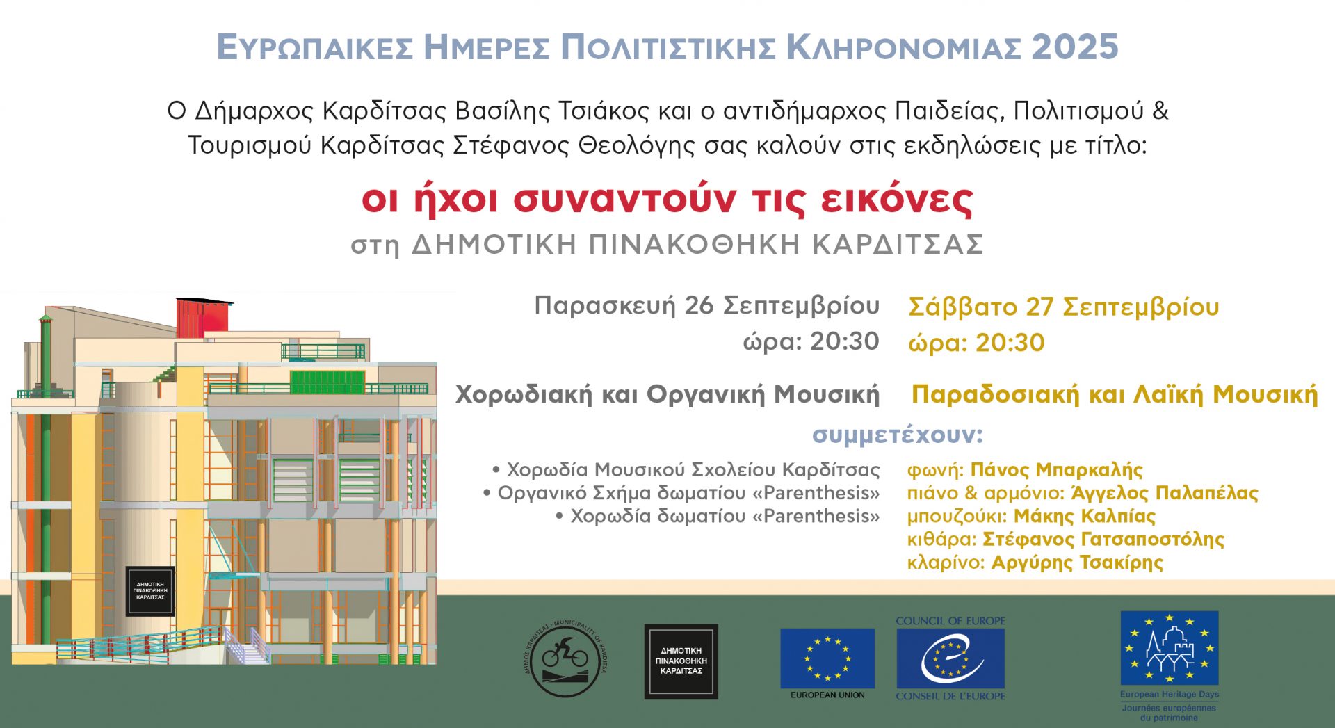 Η Δημοτική Πινακοθήκη Καρδίτσας για τη συμμετοχή της επέλεξε να φιλοξενήσει στο χαρακτηριστικό, όσο και πολύπαθο κτίριό της ένα διήμερο εκδηλώσεων με τον τίτλο: οι ήχοι συναντούν τις εικόνες στη Δημοτική Πινακοθήκη Καρδίτσας (26 και 27.9.2025). Για τον σκοπό αυτό εξασφάλισε τη συνεργασία με διάφορες μουσικές ομάδες. Χορωδιακά σχήματα, μουσική δωματίου, παραδοσιακή και λαϊκή μουσική. Ποικιλία ακουσμάτων που θα συναντηθούν, θα επηρεάσουν και θα επηρεαστούν από τα οπτικά ερεθίσματα των εικαστικών έργων που εκτίθενται στην ΔΠΚ, τις φωτογραφίες του Γιώργου Κατσάγγελου με τον τίτλο: Γυναίκες του Κόσμου και την μόνιμη έκθεση της ΔΠΚ με τα έργα των καρδιτσιωτών καλλιτεχνών της παλαιότερης γενιάς. Πολυσημία συγκινήσεων για τις φίλες και φίλους της ΔΠΚ, της μουσικής και της τέχνης γενικότερα που θα επιλέξουν αυτό το διήμερο να επισκεφτούν την ΔΠΚ. Ταυτόχρονα η επιλογή αυτών των εκδηλώσεων αποτελεί και μια δήλωση από την μεριά της ΔΠΚ για τη μεγάλη επιθυμία της να φιλοξενήσει και στο μέλλον μουσικές εκδηλώσεις. Πρόκειται για ένα πειραματισμό που δεν επιθυμεί να μείνει ανενεργός.