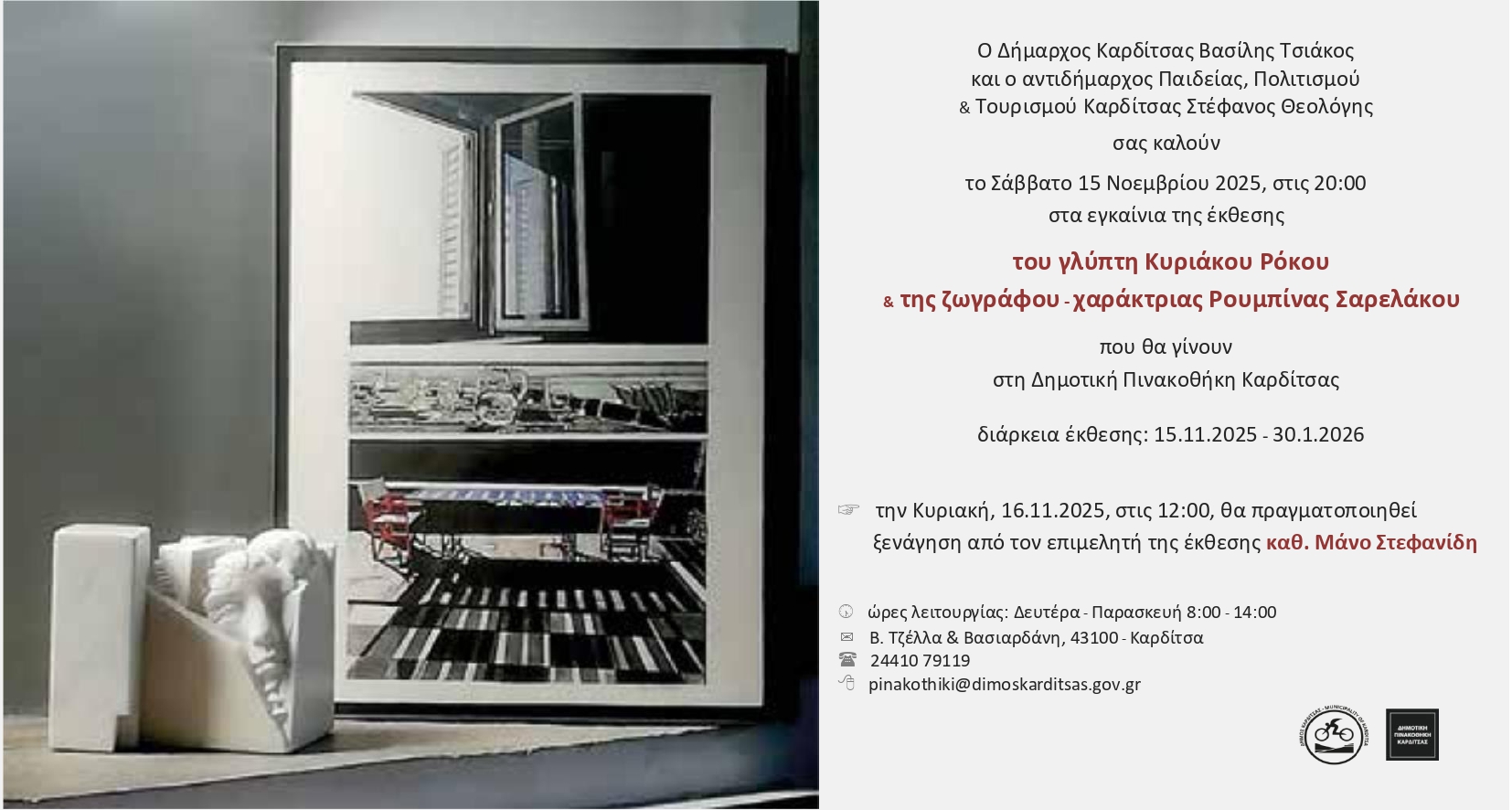 Το Σάββατο 15 Νοεμβρίου 2025, στις 20:00 πραγματοποιούνται τα εγκαίνια της έκθεσης του γλύπτη Κυριάκου Ρόκου & της ζωγράφου – χαράκτριας Ρουμπίνας Σαρελάκου.